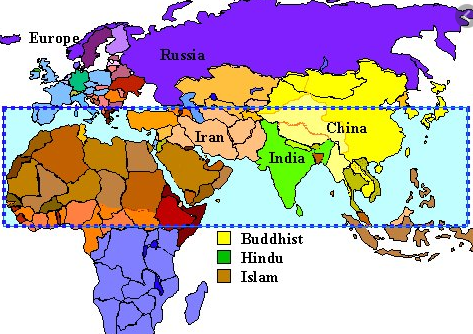 - El predominio de los tres grandes bloques religiosos no cristianos tienen su sede en esta región (Islam, Budismo, Hinduismo).